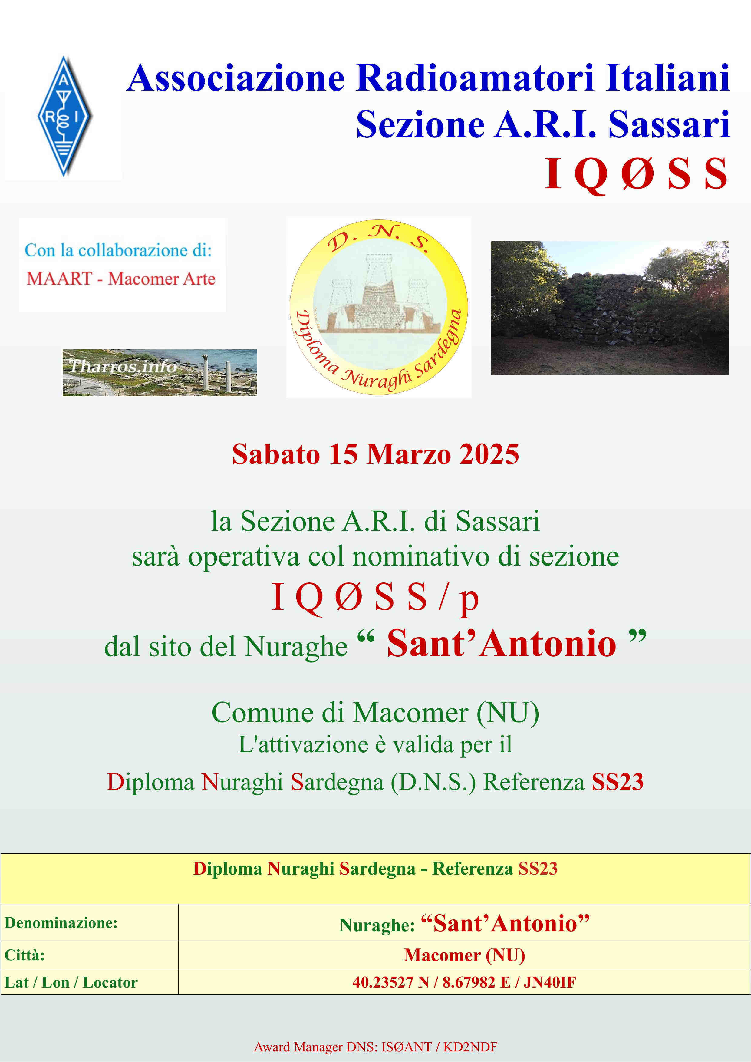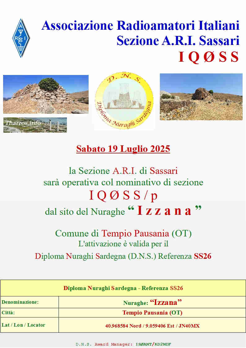 L' attivazione, valida per il Diploma dei Nuraghi Sardi, è stata programmata dai Colleghi della Sezione ARI di Sassari nella giornata di sabato 15 Marzo 2025