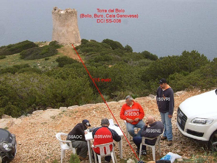Il 05/04/2009 è la volta della Torre del Bolo, ubicata tra Cala della Dragunara e Capo Caccia, nel golfo di Porto Conte (Alghero). Partenza fissata per le 8,30, al punto d'incontro sono presenti IS0VRI Massimiliano, IS0AOC Fabrizio, IS0SNE Andrea, IS0WFI Michele, IS0RAG Renato, IS0SWW Walter, IS0EBO Antonio, più tardi ci raggiunge Jens IS0XKE, che opereranno IQ0SS/P dal WWLocator JN40BN, referenza D.C.I. SS-008, mai attivata prima. La torre, come visibile dalle foto seguenti è situata su un piccolo promontori alto circa 34 metri s.l.m. sul promontorio di Cala Calcina, è facilmente raggiungibile. Realizzata in calcare, ha una volta a cupola ed una scala curva in muratura, per il terrazzo; all’interno la sala ed una cisterna, si tratta di una delle torri del sistema di avvistamento anti barbarico, deliberato dal parlamento Sardo convocato da Filippo II d'Aragona costruita tra il 1572 ed il 1578. Per alcuni dati tecnico-storici vedi il seguente "link". Anche questa torre è stata recentemente consolidata dalla Sopraintendenza B.A.A.S. di SS/NU si trova in discrete condizioni. La torre domina sia Cala Dragunara che Cala del Bollo, è in perfetto contatto ottico con l'intero sistema di torri che controllava l'accesso al più grande porto naturale del Mediterraneo: Porto Conte (golfo delle ninfe). Raggiunta la meta, ubichiamo la stazione a poca distanza dalla Torre del Bolo.
