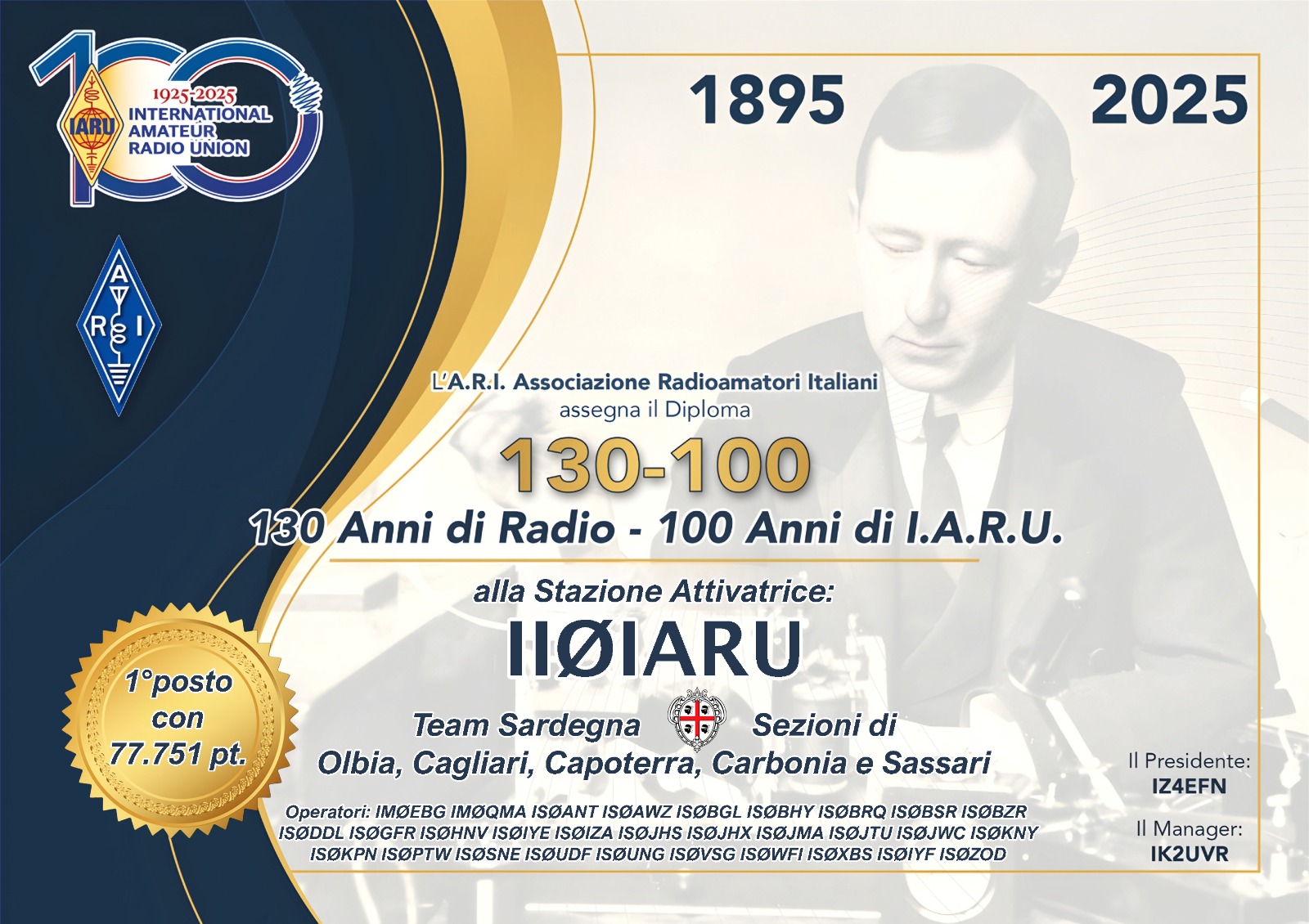 Diploma indetto dall' ARI per i 130 anni di radio e i 100 anni della IARU