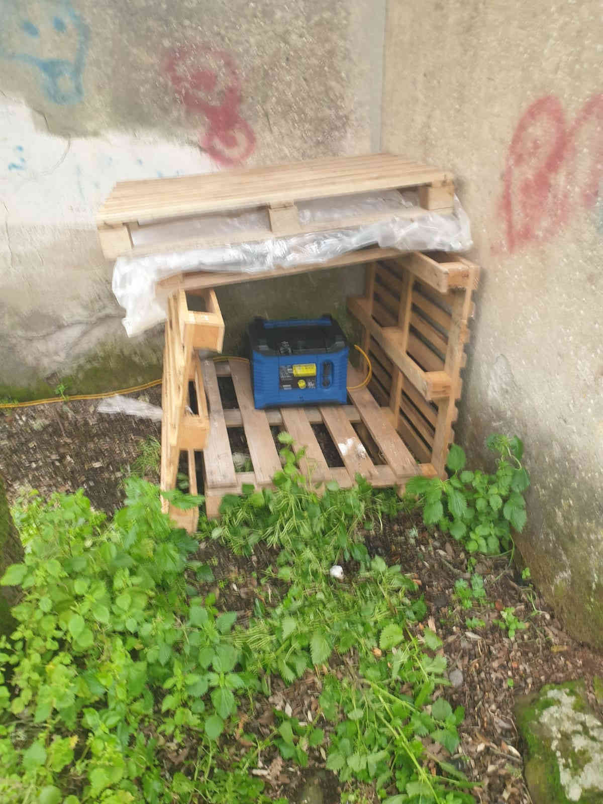 Un riparo di fortuna consente di posizionare al sicuro anche il piccolo generatore elettrico